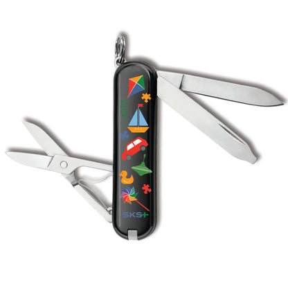 The Toy Box Classic SD Swiss Army Knife by Victorinox is a Swiss Knife Shop Design Studio creation featuring a collection of old fashioned toys, from tops to kites. A small SKS logo on the back indicates that this design is only available at Swiss Knife Shop.