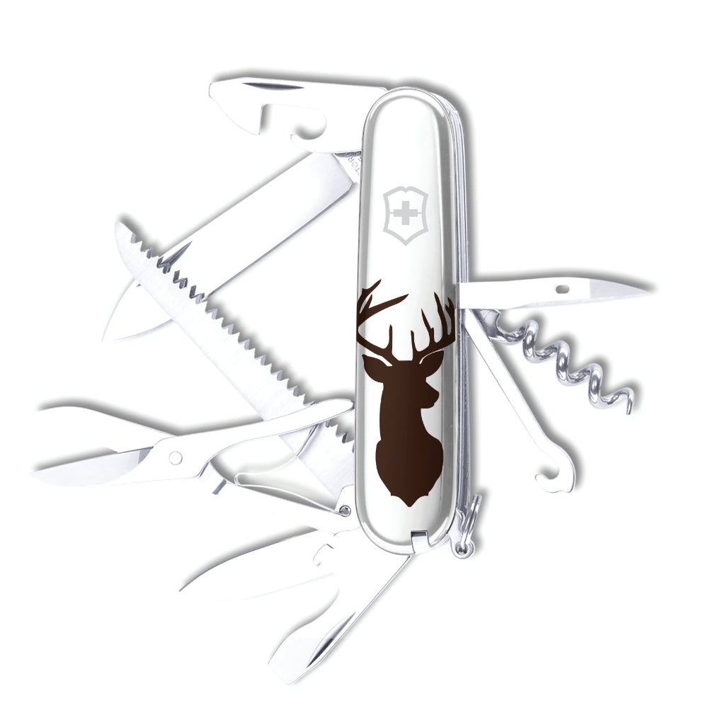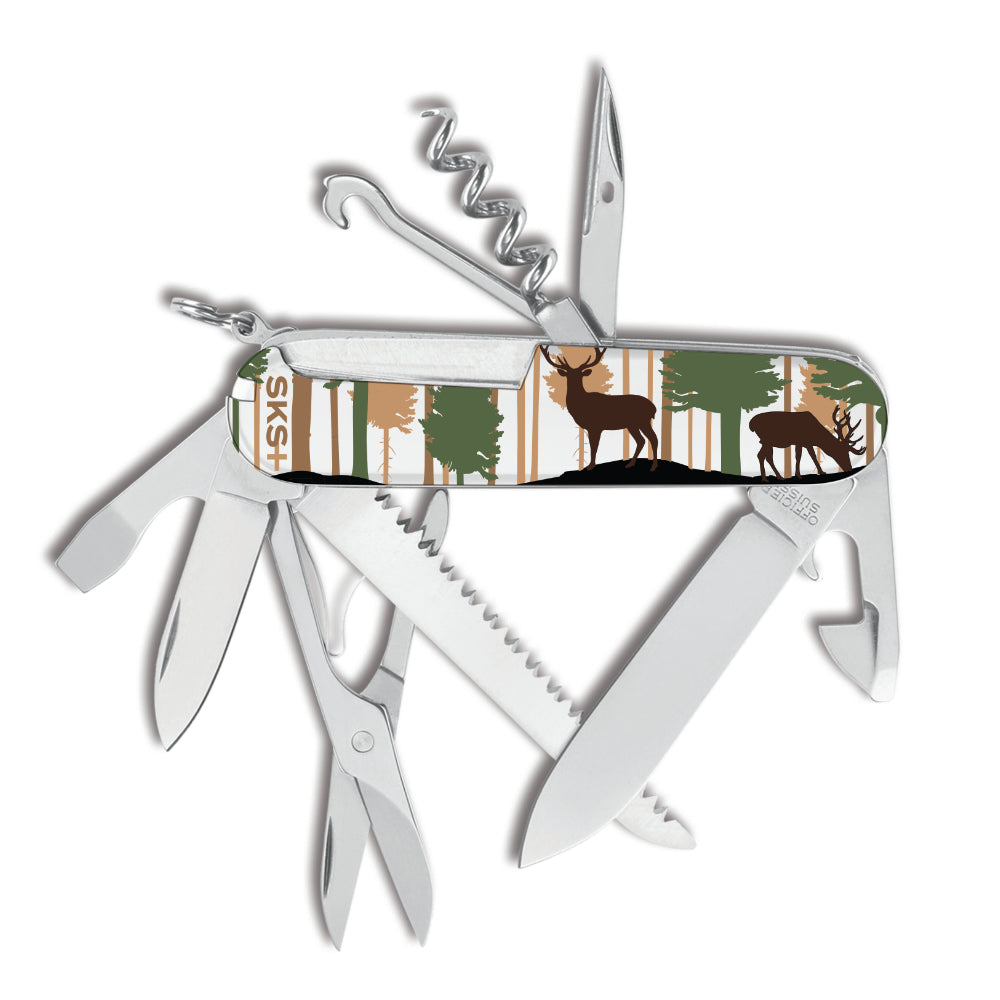 The Wild Buck Huntsman Designer Swiss Army Knife by Victorinox is a 15-function pocket knife designed for hunting and other outdoor adventures. This unique knife is a Swiss Knife Shop Design Studio creation, featuring the silhouettes of bucks on the front and back. A small SKS logo among the trees of the forest on the back indicates this knife is only available here.