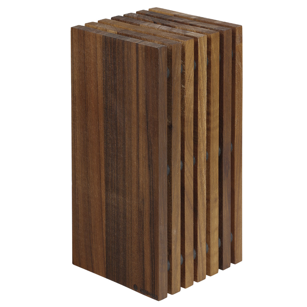 The Zassenhaus Slotted Knife Block is modern, practical way to store up to 12 knives on your kitchen counter within easy reach. This space-saving design has only a 5.12 x 5.12 inch base, and stands straight up. It is 10.2 inches tall, and can accommodate blades up to 9.8 inches long.